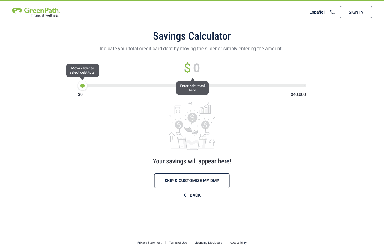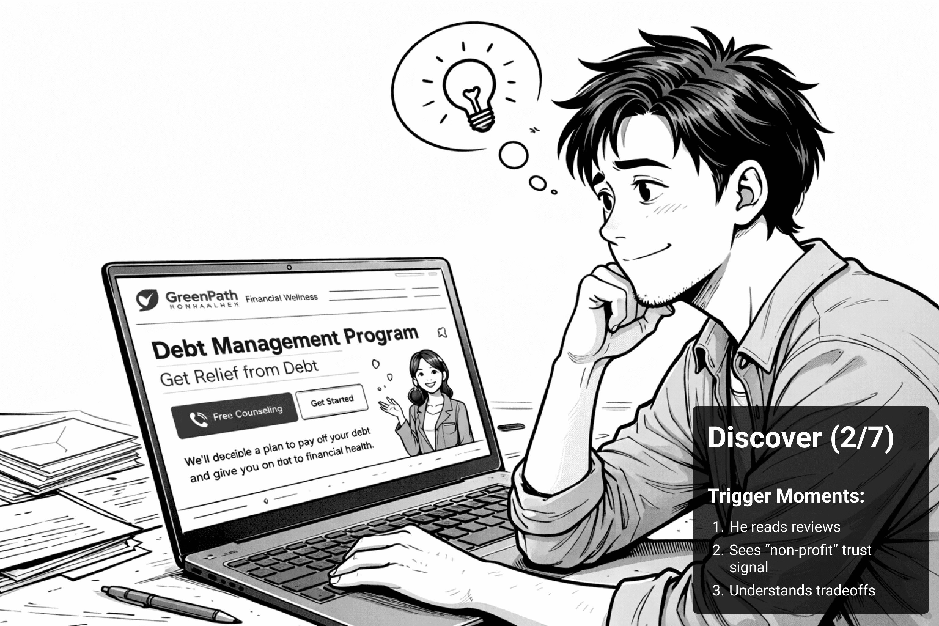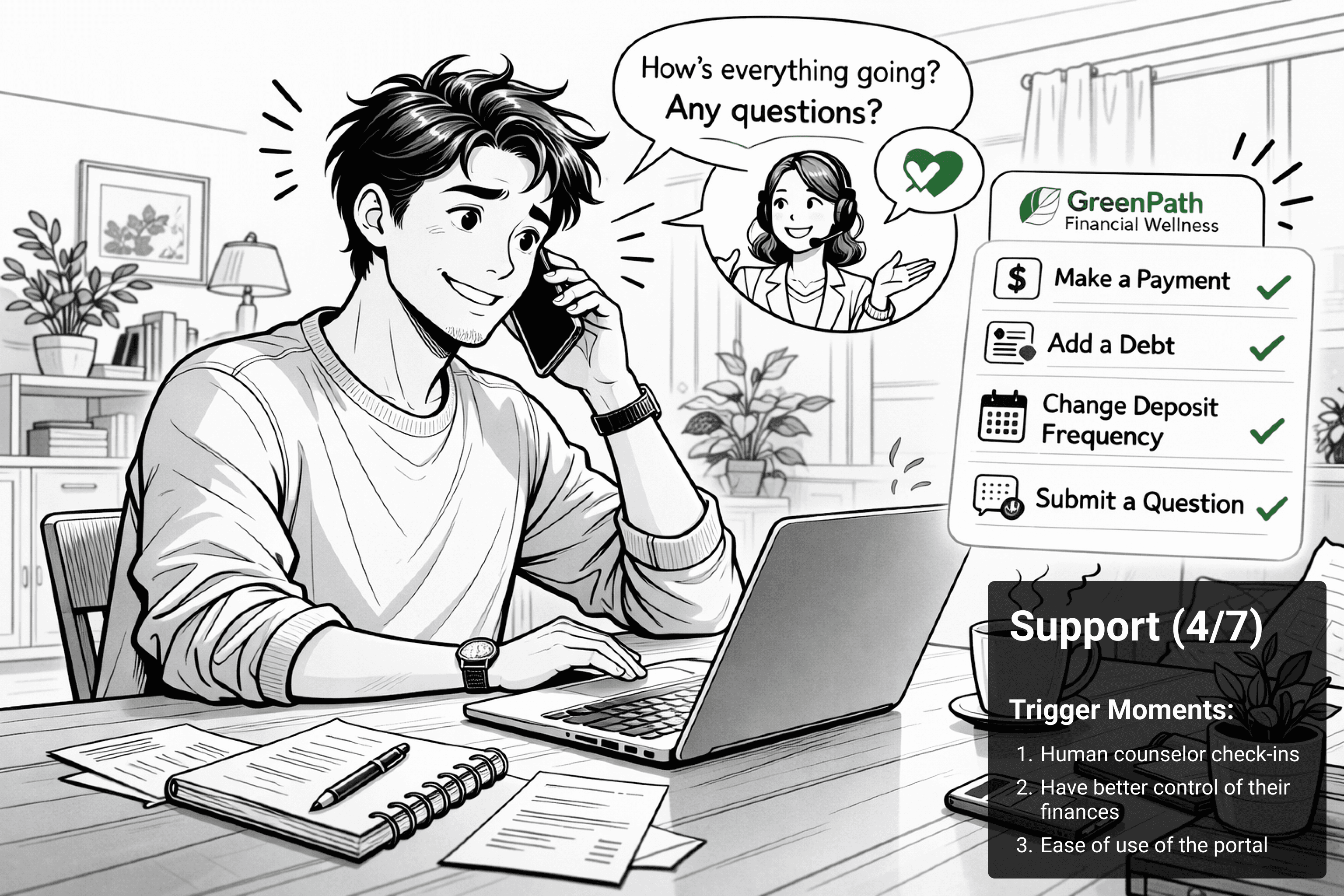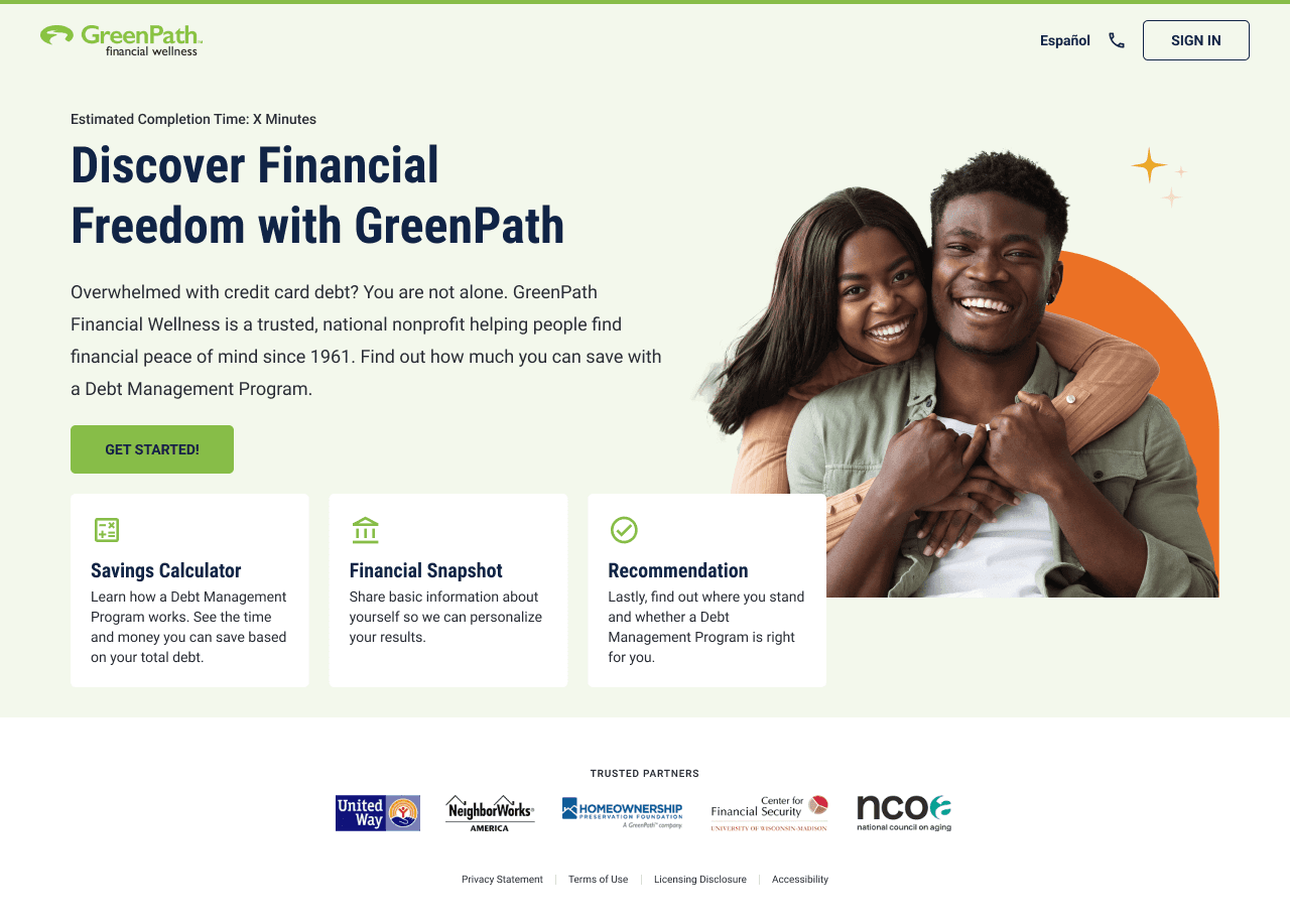 Client discovers GreenPath → Creates an account → Enrolls digitally at their own pace → Chooses when (and if) they want to speak with a counselor.