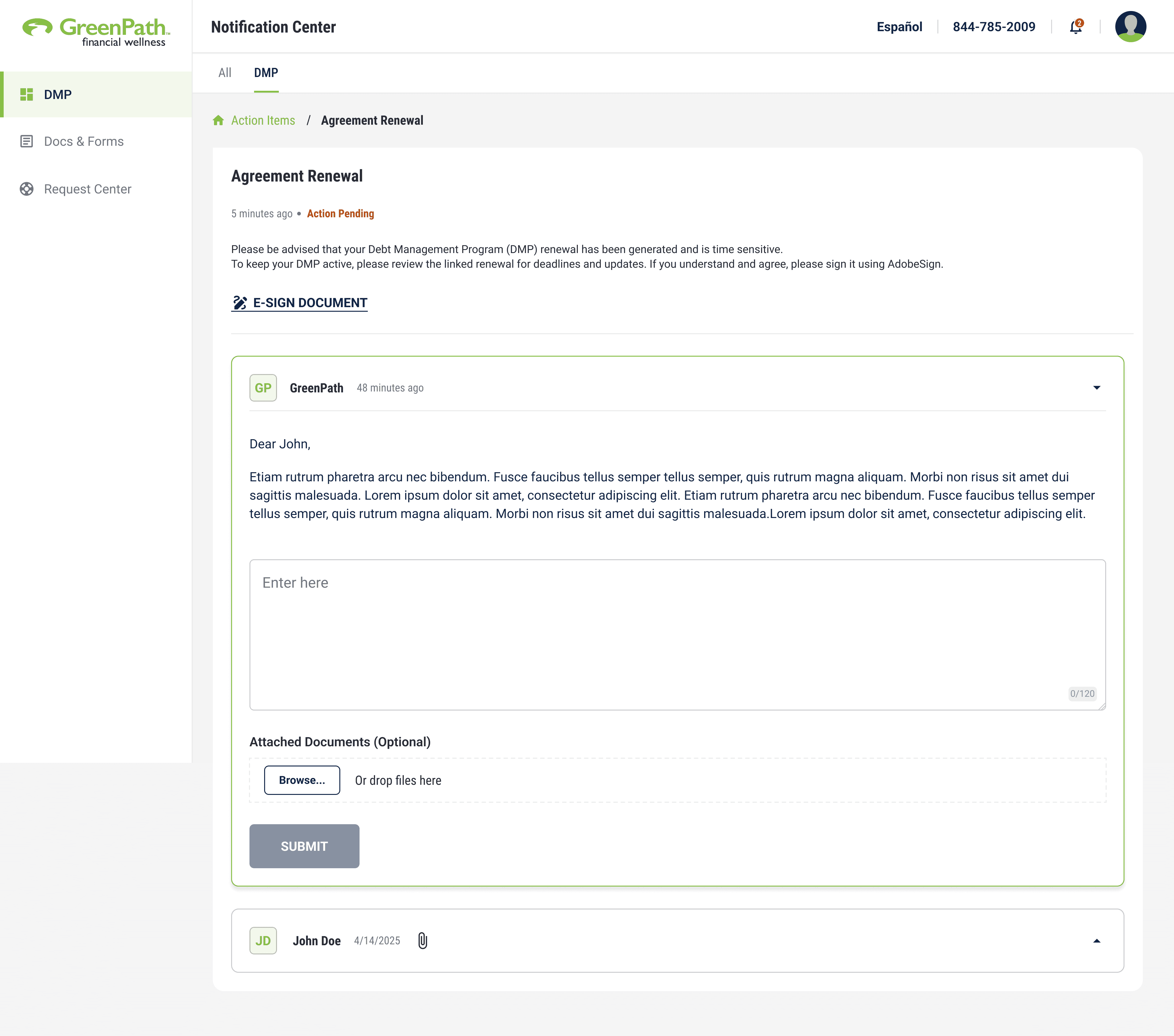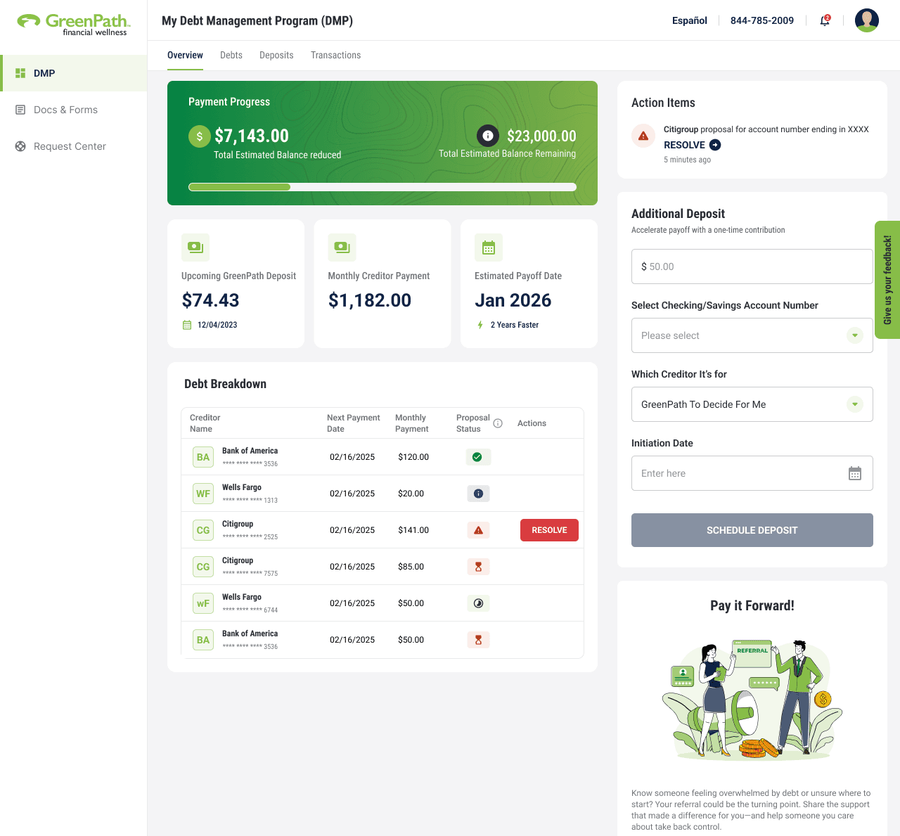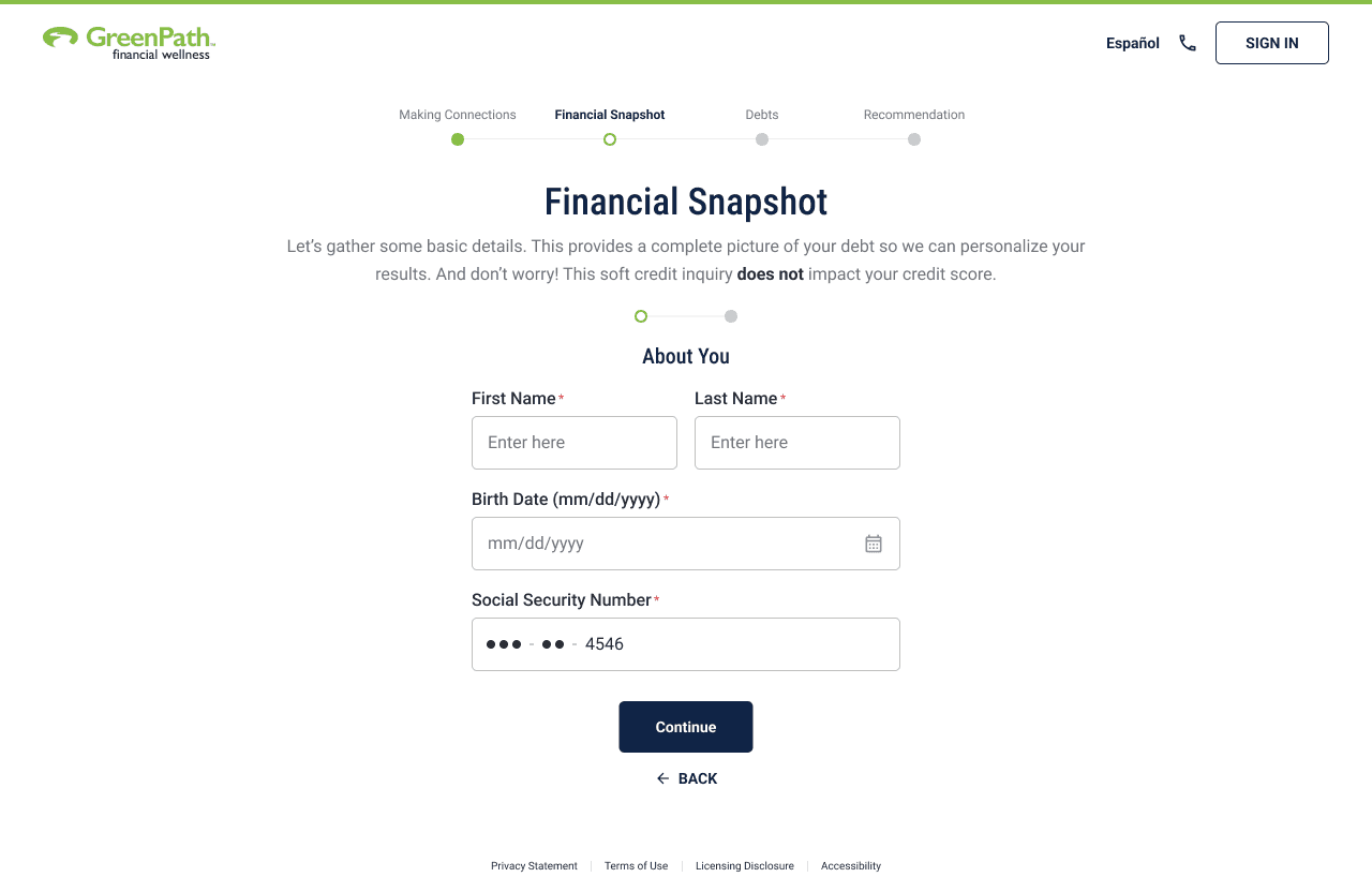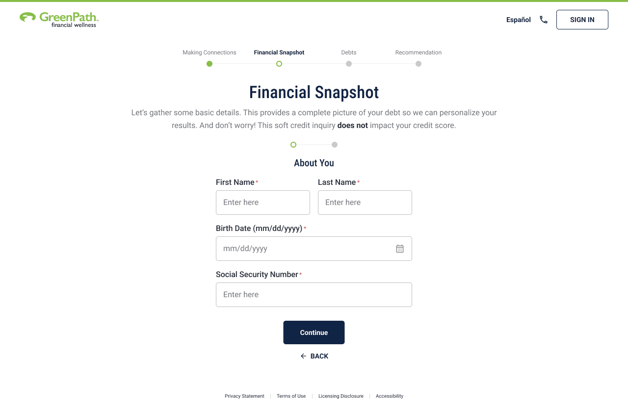 Client discovers GreenPath → Creates an account → Enrolls digitally at their own pace → Chooses when (and if) they want to speak with a counselor.